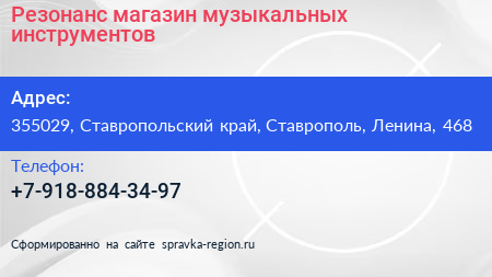 Резонанс, магазин музыкальных инструментов по адресу 355029, Ставропольский край, Ставрополь, Ленина, 468 в дальнейшем Организация, размещена в следующих категориях: