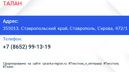 ТАЛАН по адресу 355013, Ставропольский край, Ставрополь, Серова, 472/1 в дальнейшем Организация, размещена в следующих категориях: