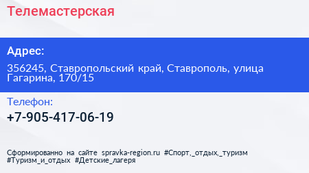 Телемастерская по адресу 356245, Ставропольский край, Ставрополь, улица Гагарина, 170/15 в дальнейшем Организация, размещена в следующих категориях: