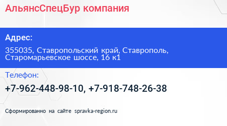 АльянсСпецБур, компания по адресу 355035, Ставропольский край, Ставрополь, Старомарьевское шоссе, 16 к1 в дальнейшем Организация, размещена в следующих категориях: