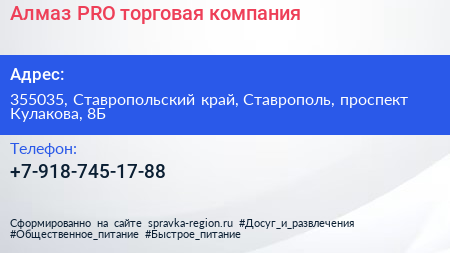 Алмаз PRO, торговая компания по адресу 355035, Ставропольский край, Ставрополь, проспект Кулакова, 8Б в дальнейшем Организация, размещена в следующих категориях: