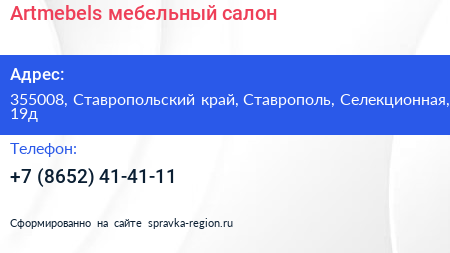 Artmebels, мебельный салон по адресу 355008, Ставропольский край, Ставрополь, Селекционная, 19д в дальнейшем Организация, размещена в следующих категориях: