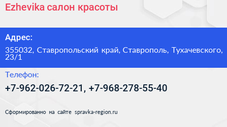 Ezhevika, салон красоты по адресу 355032, Ставропольский край, Ставрополь, Тухачевского, 23/1 в дальнейшем Организация, размещена в следующих категориях: