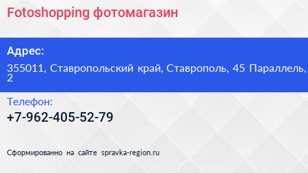 Fotoshopping, фотомагазин по адресу 355011, Ставропольский край, Ставрополь, 45 Параллель, 2 в дальнейшем Организация, размещена в следующих категориях: