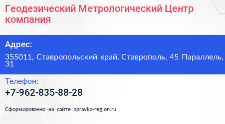 Геодезический Метрологический Центр, компания по адресу 355011, Ставропольский край, Ставрополь, 45 Параллель, 31 в дальнейшем Организация, размещена в следующих категориях: