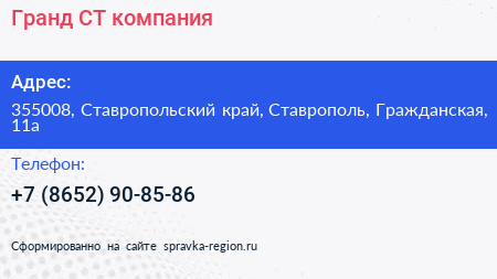 Гранд СТ, компания по адресу 355008, Ставропольский край, Ставрополь, Гражданская, 11а в дальнейшем Организация, размещена в следующих категориях: