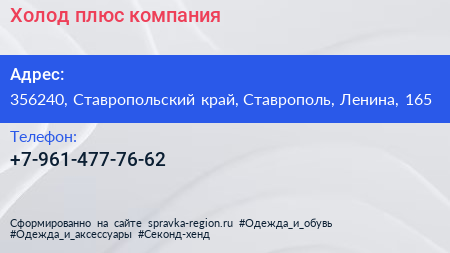 Холод плюс, компания по адресу 356240, Ставропольский край, Ставрополь, Ленина, 165 в дальнейшем Организация, размещена в следующих категориях: