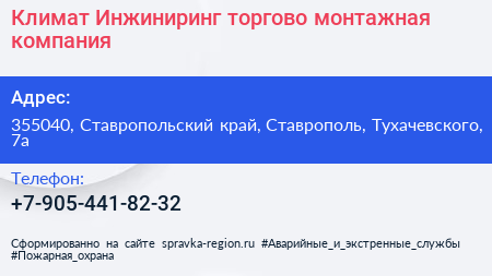 Климат-Инжиниринг, торгово-монтажная компания по адресу 355040, Ставропольский край, Ставрополь, Тухачевского, 7а в дальнейшем Организация, размещена в следующих категориях: