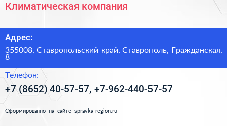 Климатическая компания по адресу 355008, Ставропольский край, Ставрополь, Гражданская, 8 в дальнейшем Организация, размещена в следующих категориях: