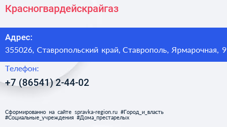 Красногвардейскрайгаз по адресу 355026, Ставропольский край, Ставрополь, Ярмарочная, 9 в дальнейшем Организация, размещена в следующих категориях: