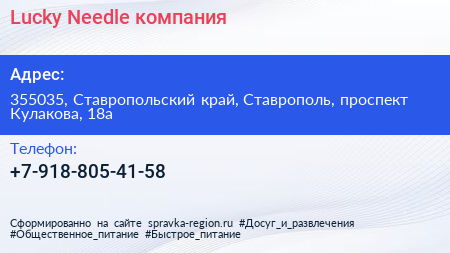 Lucky Needle, компания по адресу 355035, Ставропольский край, Ставрополь, проспект Кулакова, 18а в дальнейшем Организация, размещена в следующих категориях: