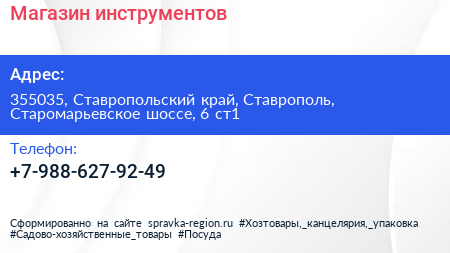 Магазин инструментов по адресу 355035, Ставропольский край, Ставрополь, Старомарьевское шоссе, 6 ст1 в дальнейшем Организация, размещена в следующих категориях: