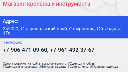 Магазин крепежа и инструмента по адресу 355020, Ставропольский край, Ставрополь, Объездная, 17в в дальнейшем Организация, размещена в следующих категориях: