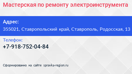 Мастерская по ремонту электроинструмента по адресу 355021, Ставропольский край, Ставрополь, Родосская, 13 в дальнейшем Организация, размещена в следующих категориях: