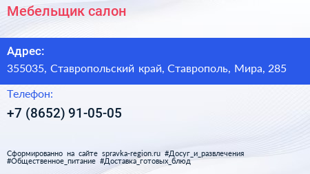 Мебельщик, салон по адресу 355035, Ставропольский край, Ставрополь, Мира, 285 в дальнейшем Организация, размещена в следующих категориях: