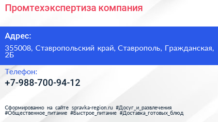 Промтехэкспертиза, компания по адресу 355008, Ставропольский край, Ставрополь, Гражданская, 2Б в дальнейшем Организация, размещена в следующих категориях: