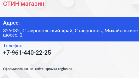 СТИН, магазин по адресу 355035, Ставропольский край, Ставрополь, Михайловское шоссе, 2 в дальнейшем Организация, размещена в следующих категориях: