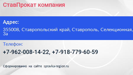 СтавПрокат, компания по адресу 355008, Ставропольский край, Ставрополь, Селекционная, 3а в дальнейшем Организация, размещена в следующих категориях: