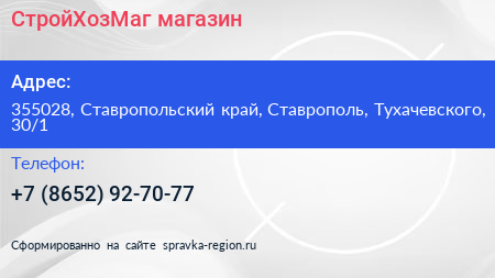 СтройХозМаг, магазин по адресу 355028, Ставропольский край, Ставрополь, Тухачевского, 30/1 в дальнейшем Организация, размещена в следующих категориях: