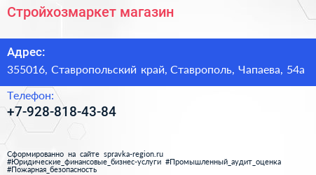 Стройхозмаркет, магазин по адресу 355016, Ставропольский край, Ставрополь, Чапаева, 54а в дальнейшем Организация, размещена в следующих категориях: