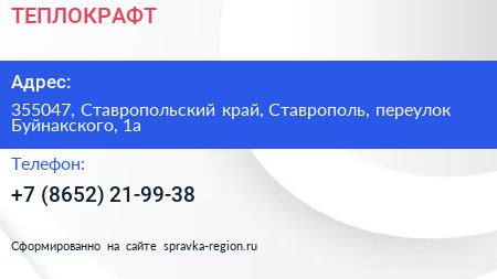 ТЕПЛОКРАФТ по адресу 355047, Ставропольский край, Ставрополь, переулок Буйнакского, 1а в дальнейшем Организация, размещена в следующих категориях: