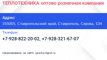 ТЕПЛОТЕХНИКА, оптово-розничная компания по адресу 355005, Ставропольский край, Ставрополь, Серова, 134 в дальнейшем Организация, размещена в следующих категориях: