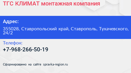 ТГС-КЛИМАТ, монтажная компания по адресу 355028, Ставропольский край, Ставрополь, Тухачевского, 24/2 в дальнейшем Организация, размещена в следующих категориях: