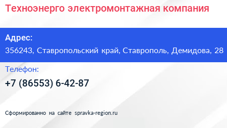 Техноэнерго, электромонтажная компания по адресу 356243, Ставропольский край, Ставрополь, Демидова, 28 в дальнейшем Организация, размещена в следующих категориях: