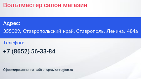Вольтмастер, салон-магазин по адресу 355029, Ставропольский край, Ставрополь, Ленина, 484а в дальнейшем Организация, размещена в следующих категориях: