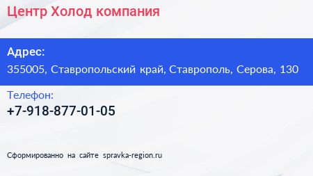 Центр-Холод, компания по адресу 355005, Ставропольский край, Ставрополь, Серова, 130 в дальнейшем Организация, размещена в следующих категориях: