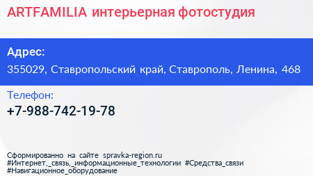 ARTFAMILIA, интерьерная фотостудия по адресу 355029, Ставропольский край, Ставрополь, Ленина, 468 в дальнейшем Организация, размещена в следующих категориях: