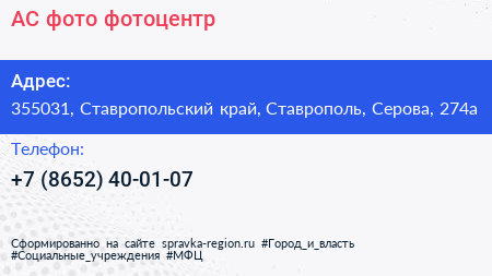 АС-фото, фотоцентр по адресу 355031, Ставропольский край, Ставрополь, Серова, 274а в дальнейшем Организация, размещена в следующих категориях: