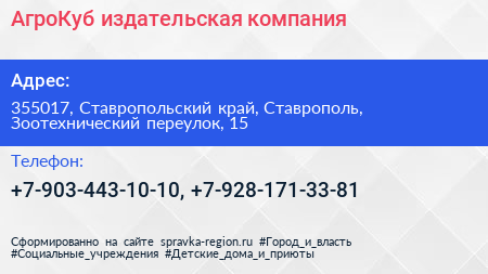 АгроКуб, издательская компания по адресу 355017, Ставропольский край, Ставрополь, Зоотехнический переулок, 15 в дальнейшем Организация, размещена в следующих категориях:
