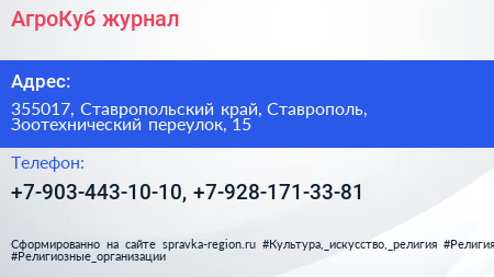 АгроКуб, журнал по адресу 355017, Ставропольский край, Ставрополь, Зоотехнический переулок, 15 в дальнейшем Организация, размещена в следующих категориях: