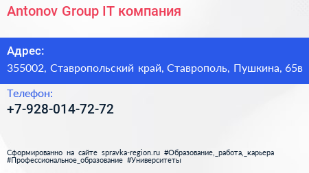 Antonov Group, IT-компания по адресу 355002, Ставропольский край, Ставрополь, Пушкина, 65в в дальнейшем Организация, размещена в следующих категориях: