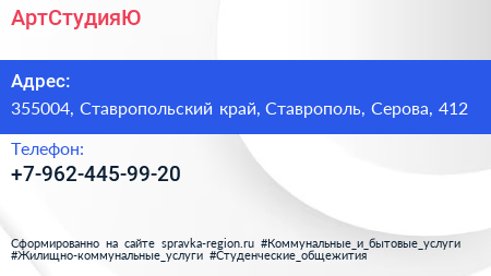 АртСтудияЮ по адресу 355004, Ставропольский край, Ставрополь, Серова, 412 в дальнейшем Организация, размещена в следующих категориях: