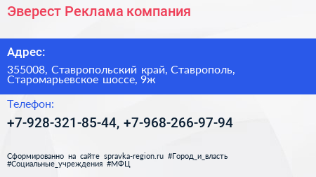 Эверест-Реклама, компания по адресу 355008, Ставропольский край, Ставрополь, Старомарьевское шоссе, 9ж в дальнейшем Организация, размещена в следующих категориях: