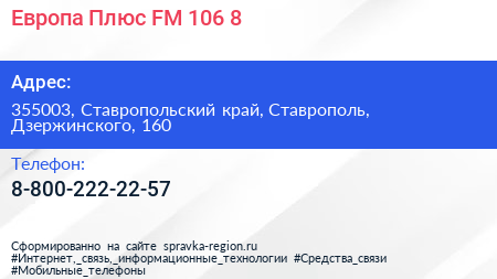 Европа Плюс, FM 106.8 по адресу 355003, Ставропольский край, Ставрополь, Дзержинского, 160 в дальнейшем Организация, размещена в следующих категориях: