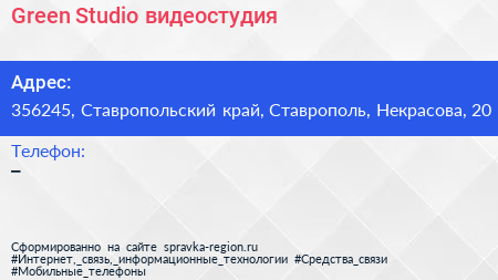 Green Studio, видеостудия по адресу 356245, Ставропольский край, Ставрополь, Некрасова, 20 в дальнейшем Организация, размещена в следующих категориях: