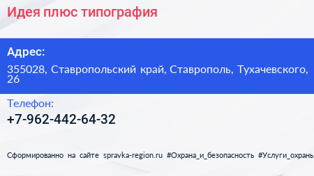 Идея плюс, типография по адресу 355028, Ставропольский край, Ставрополь, Тухачевского, 26 в дальнейшем Организация, размещена в следующих категориях: