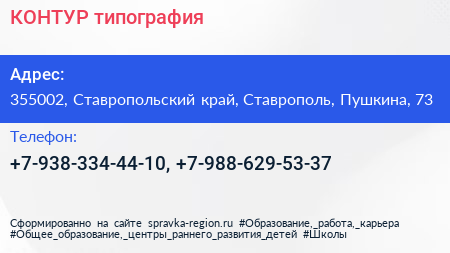 КОНТУР, типография по адресу 355002, Ставропольский край, Ставрополь, Пушкина, 73 в дальнейшем Организация, размещена в следующих категориях: