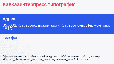 Кавказинтерпресс, типография по адресу 355002, Ставропольский край, Ставрополь, Лермонтова, 191Б в дальнейшем Организация, размещена в следующих категориях: