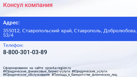 Консул, компания по адресу 355012, Ставропольский край, Ставрополь, Добролюбова, 53/4 в дальнейшем Организация, размещена в следующих категориях: