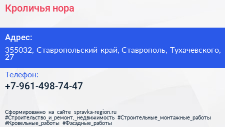 Кроличья нора по адресу 355032, Ставропольский край, Ставрополь, Тухачевского, 27 в дальнейшем Организация, размещена в следующих категориях: