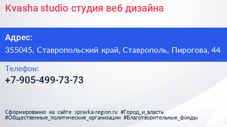 Kvasha studio, студия веб-дизайна по адресу 355045, Ставропольский край, Ставрополь, Пирогова, 44 в дальнейшем Организация, размещена в следующих категориях:
