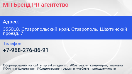 МП-Бренд, PR-агентство по адресу 355018, Ставропольский край, Ставрополь, Шахтинский проезд, 7 в дальнейшем Организация, размещена в следующих категориях: