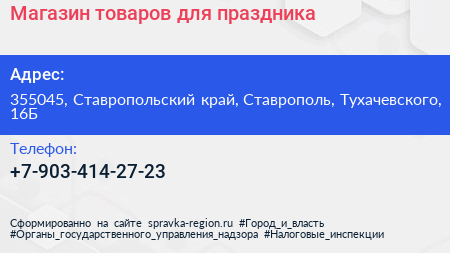 Магазин товаров для праздника по адресу 355045, Ставропольский край, Ставрополь, Тухачевского, 16Б в дальнейшем Организация, размещена в следующих категориях: