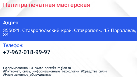Палитра, печатная мастерская по адресу 355021, Ставропольский край, Ставрополь, 45 Параллель, 34 в дальнейшем Организация, размещена в следующих категориях: