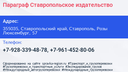 Параграф, Ставропольское издательство по адресу 355035, Ставропольский край, Ставрополь, Розы Люксембург, 57 в дальнейшем Организация, размещена в следующих категориях: