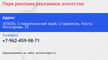 Парк реклама, рекламное агентство по адресу 355035, Ставропольский край, Ставрополь, Коста Хетагурова, 11 в дальнейшем Организация, размещена в следующих категориях: